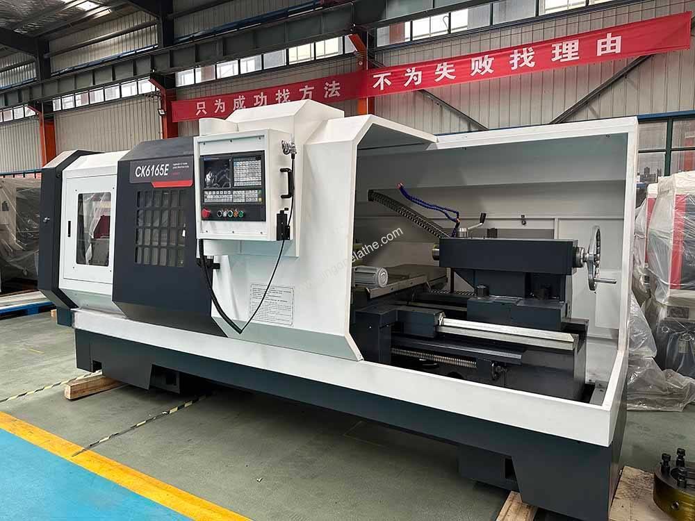 A: The CK6165E CNC flat bed lathe uses solid one-piece casting and box way guideways, providing high rigidity to handle aggressive heavy roughing with minimal vibration.