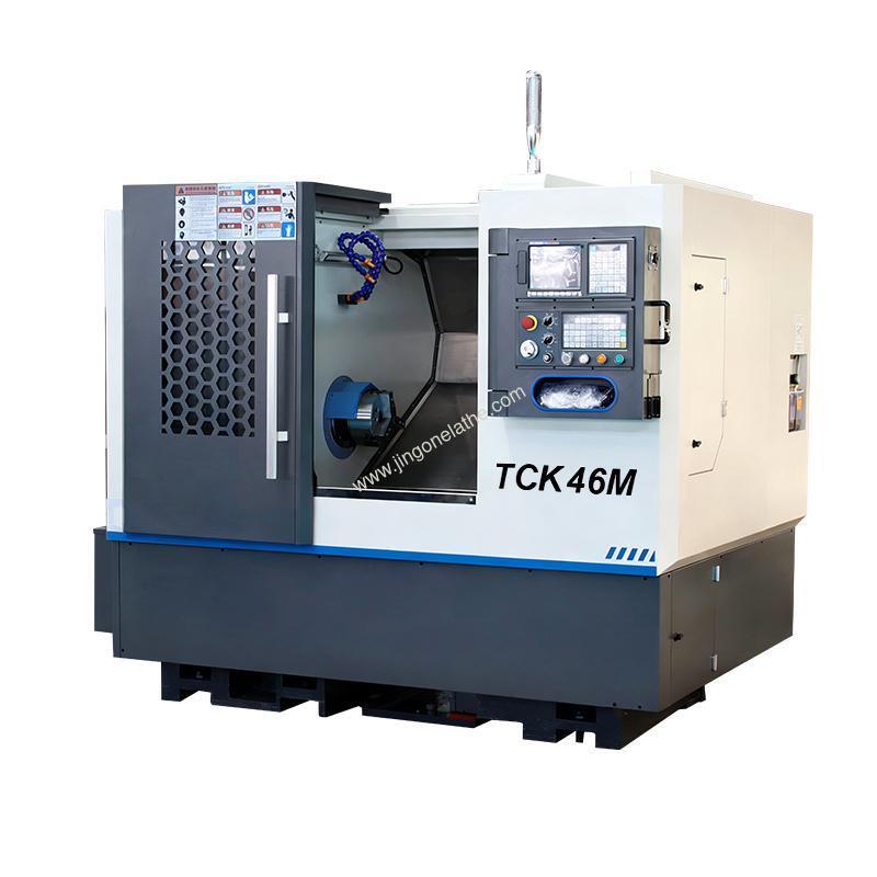 The TCK46A is a compact CNC turn-mill center and high-precision small CNC turning center built for efficient, multi-step machining. This industrial-grade turning machine features a 30° slant bed, HIWIN linear guide rails, and a BMT45 live tool turret to handle complex parts in one setup.